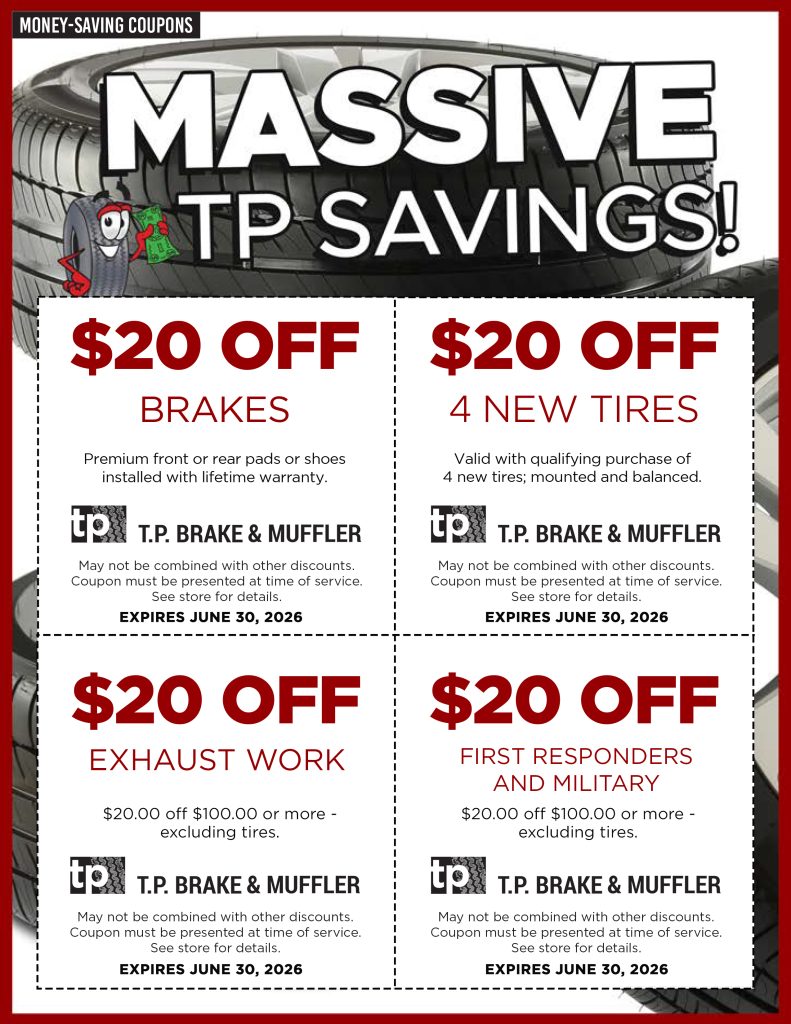 Keep coming back to the TP Brake and Muffler website to save on brakes, exhaust systems, shocks and struts, tires, mufflers, and oil changes because these coupons will change every month.